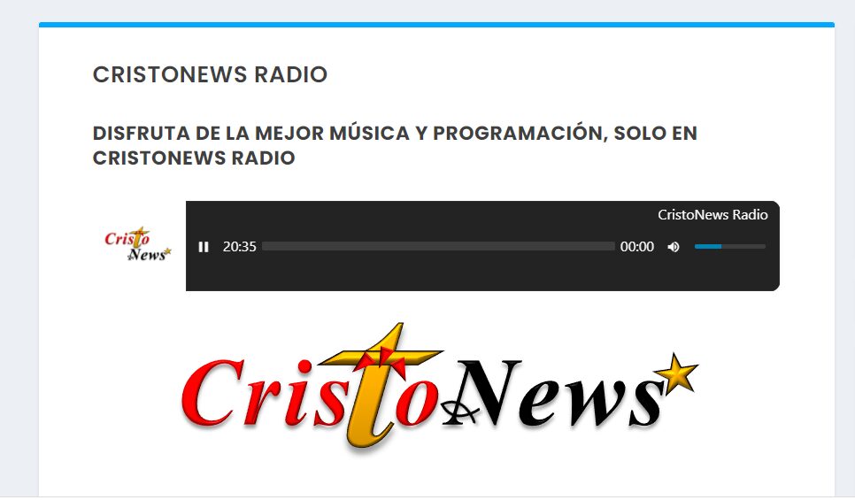(Cristo News – Redacción – Juvenal Cubillán) Global. Nuestro portal https://cristonews.us/ pone a disposción de todos público, y principalmenre los radioescuchas cristianos, nuestra radio con música cristiana exclusivamente en español e inivita a todos a visitar el sitio https://cristonews.us/cristonews-radio/, la cual transmite en línea 24 horas al día los 7 días de la semana. la radio online también ofrecerá espacios de música de cristiana y alabanza en inglés.