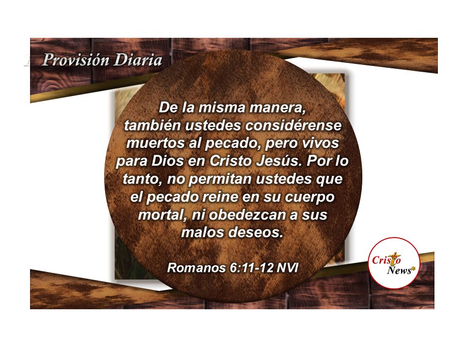 Este verso en la versión de la Biblia versión Traducción La Pasión (TPT) dice de la siguiente manera: Por lo tanto, ¡que sea lo mismo con ustedes! Puesto que ahora estáis unidos a él, debéis consideraros continuamente como muertos e insensibles a la apelación del pecado mientras vivís diariamente para el placer de Dios en unión con Jesús, el Ungido.El pecado es un monarca destronado; así que ya no debes darle la oportunidad de gobernar tu vida, controlando tu forma de vivir y obligándote a obedecer sus deseos y antojos (Romanos 6:11-12 TPT)