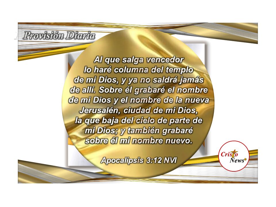 Este verso en la versión de la Biblia versión Traducción La Pasión (TPT) dice: Para el que salga victorioso, haré que seas una columna en el santuario de mi Dios, permanentemente segura. Escribiré en ti el nombre de mi Dios y el nombre de la ciudad de mi Dios: la Nueva Jerusalén, que desciende de mi Dios desde el cielo. Y escribiré en ti mi propio nombre. (Apocalipsis 3:12 TPT)