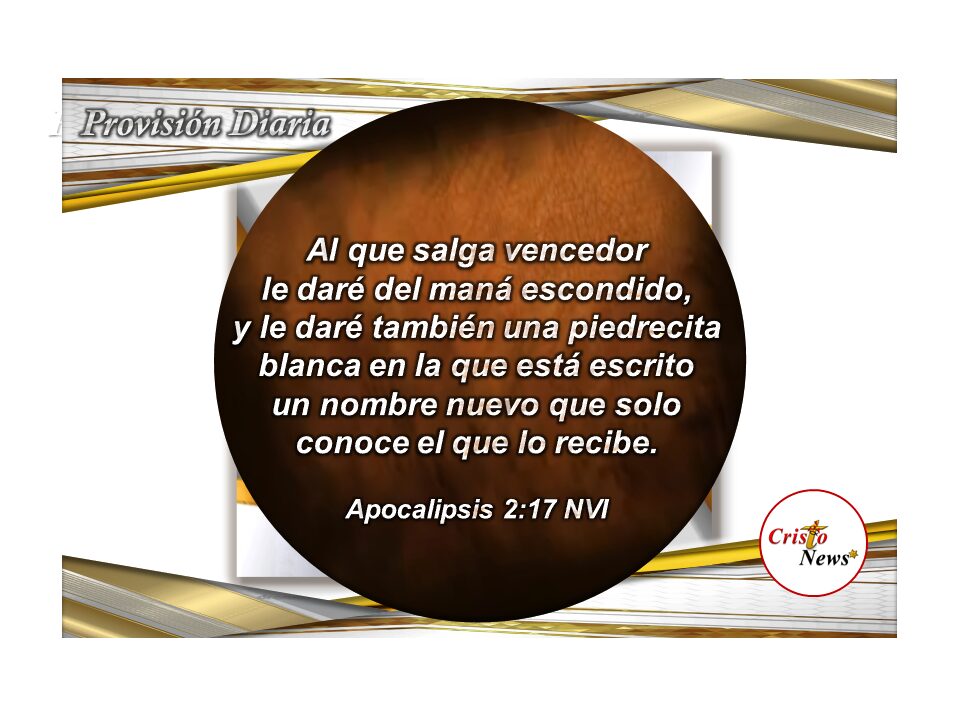 Este verso en la versión de la Biblia versión Traducción La Pasión (TPT) dice: Pero el que tenga el corazón abierto, que escuche con atención lo que el Espíritu está diciendo actualmente a todas las iglesias. A todo el que salga victorioso le haré comer el maná escondido y le daré una piedra blanca y brillante. Y en la piedra blanca estará inscrito su nuevo nombre, conocido sólo por el que lo reciba. (Apocalipsis 2:17 TPT)