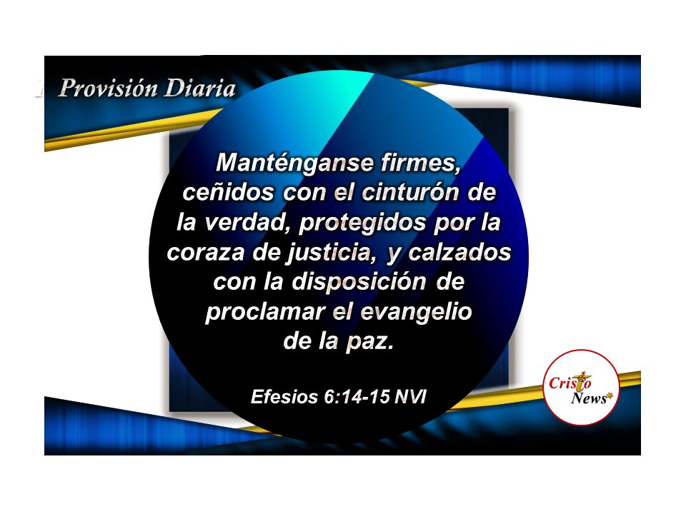 Este versículo en la versión Traducción La Pasión (TPT) dice: Ponte la verdad como cinturón que te fortalezca para permanecer en el triunfo. Ponte la santidad como la armadura protectora que cubre tu corazón. 15Ponte de pie y alerta, entonces siempre estarás listo para compartir las bendiciones de la paz. (Efesios 6:14-15 TPT)
