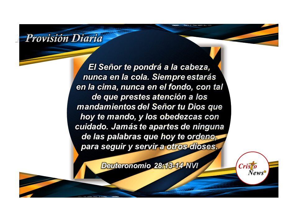 El Señor te pondrá a la cabeza, nunca en la cola. Siempre estarás en la cima, nunca en el fondo, con tal de que prestes atención a los mandamientos del Señor tu Dios que hoy te mando, y los obedezcas con cuidado. Jamás te apartes de ninguna de las palabras que hoy te ordeno, para seguir y servir a otros dioses.