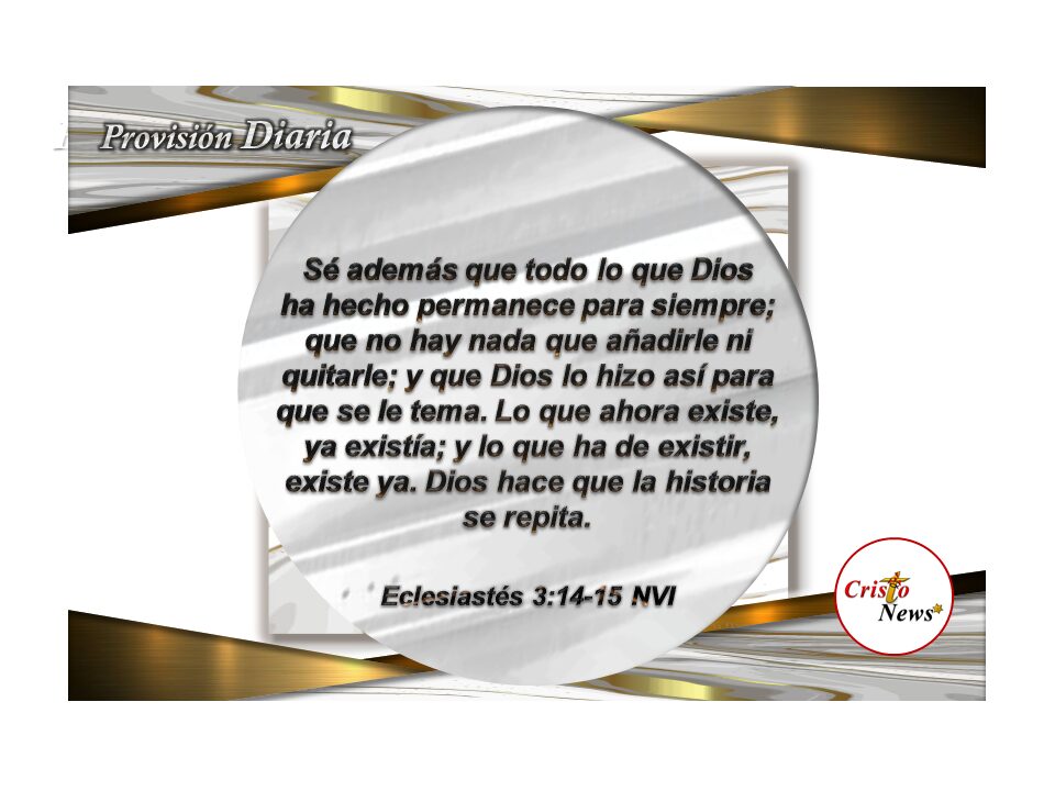 En la versión Reina Valera 1960 esta Palabra dice: 14 Sé además que todo lo que Dios ha hecho permanece para siempre; que no hay nada que añadirle ni quitarle; y que Dios lo hizo así para que se le tema. 15 Lo que ahora existe, ya existía; y lo que ha de existir, existe ya. Dios hace que la historia se repita. (Eclesiastés 3:14-15 RVR1960)