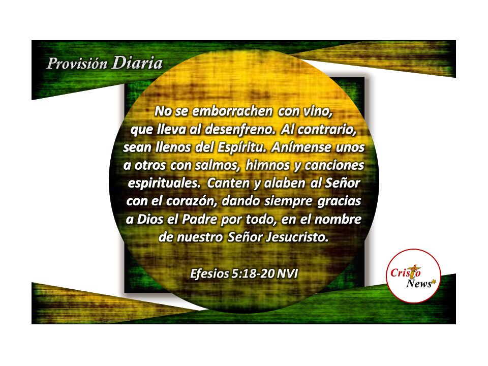 En la versión Reina Valera 1960 esta Palabra dice: 18 No se emborrachen con vino, que lleva al desenfreno. Al contrario, sean llenos del Espíritu. 19 Anímense unos a otros con salmos, himnos y canciones espirituales. Canten y alaben al Señor con el corazón, 20 dando siempre gracias a Dios el Padre por todo, en el nombre de nuestro Señor Jesucristo. (Efesios 5:18-20 RVR1960)