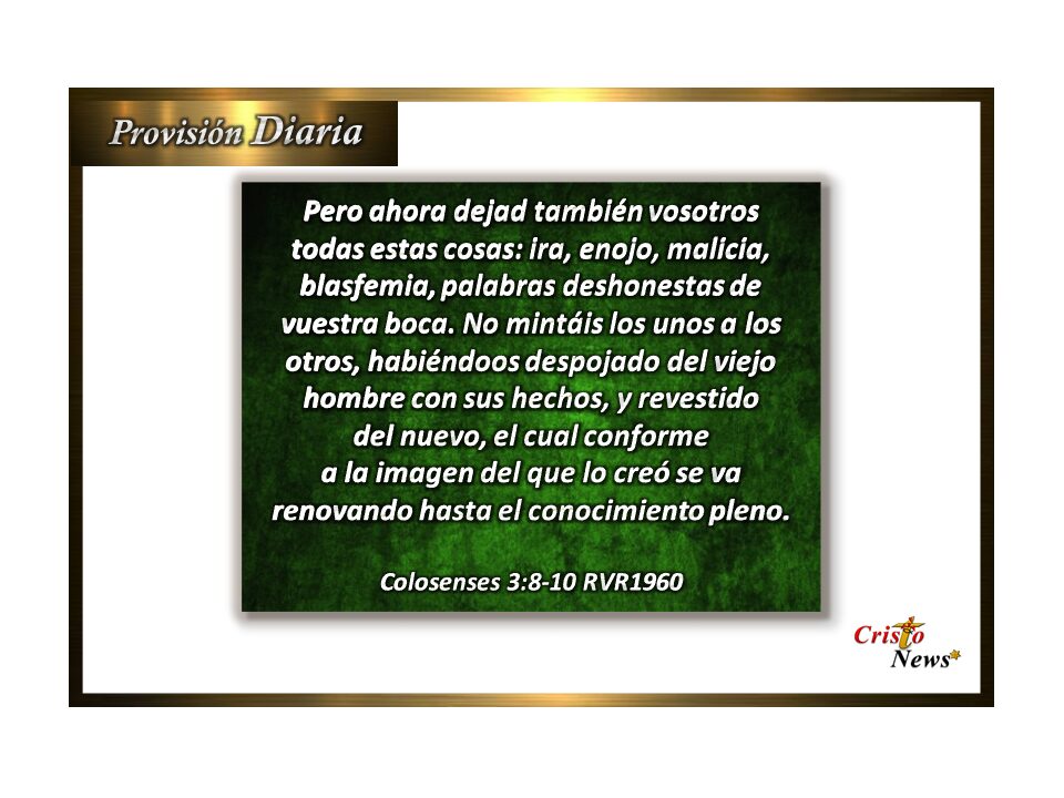 Esta Palabra en la versión Reina Valera 1960 esta Palabra dice: Pero ahora abandonen también todo esto: enojo, ira, malicia, calumnia y lenguaje obsceno. Dejen de mentirse unos a otros, ahora que se han quitado el ropaje de la vieja naturaleza con sus vicios, 10 y se han puesto el de la nueva naturaleza, que se va renovando en conocimiento a imagen de su creador. (Colosenses 3:8-10 RVR1960)